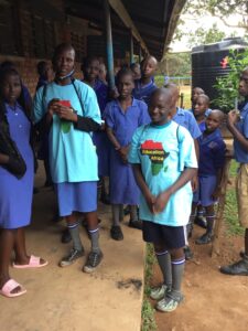 Joan and Susan saying bye to Dr. John Wathum-Ocama as he leaves after visiting them at their school.